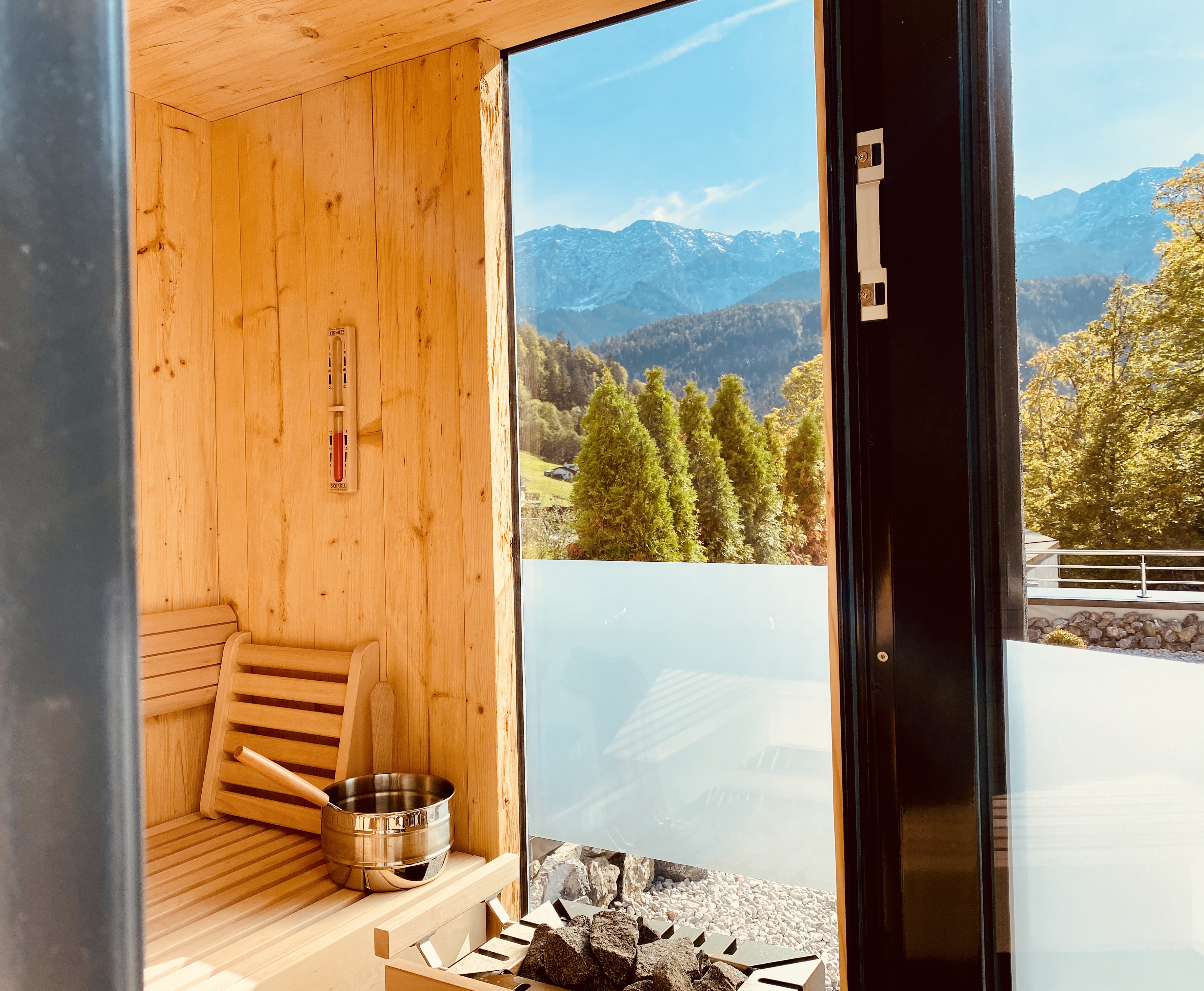Spa Nest mit privater Sauna - Panoramablick zur Sonnenseite mit Terrasse